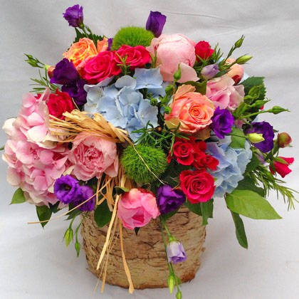 An explosion specially selected summer flowers, spilling out of a rustic basket. This beautifully arranged display makes for an extra special gift.